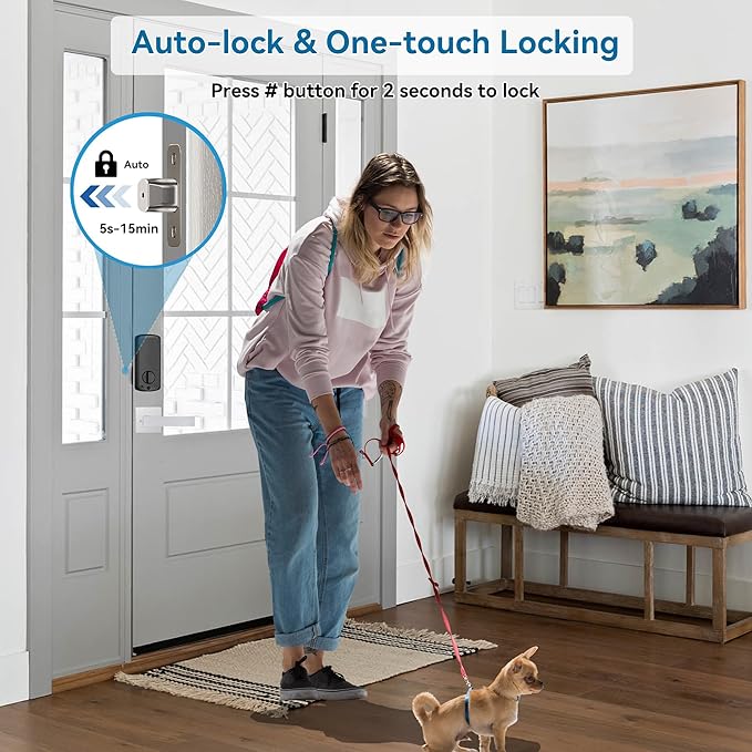 - [All in 1 Fingerprint Door Lock] Fingerprints/ App/Passcode/IC Cards/Physical Keys/E-key. Smart deadbolt locks are always ready to protect your home, allowing you to set auto lock between 5~900 seconds or apply 1-touch motorized locking, press # on keypad for 2s to activate one-touch lock.