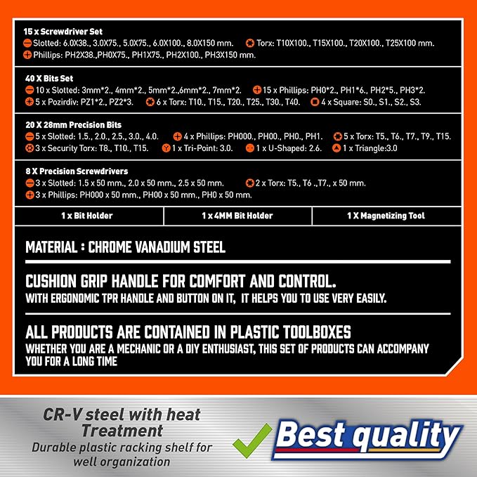 - 86-piece magnetic screwdriver set consists of 10PC Conventional screwdriver,4PC Torx screwdriver,9PC Precision Screwdriver and 40PC screwdriver bits. including Phillips, Slotted, Torx, Hex and Pozidriv, 20PC Precision bits, 1 Magnetizer Demagnetizer Tools