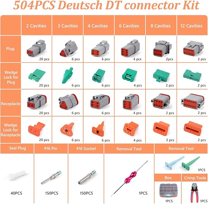 504PCS Deutsch Connectors Kit with Crimping Tool, 2/3/4/6/8/12 Pin DT Connectors with Removal Tool, Size 16 Solid Terminal Contacts, 14-18 AWG