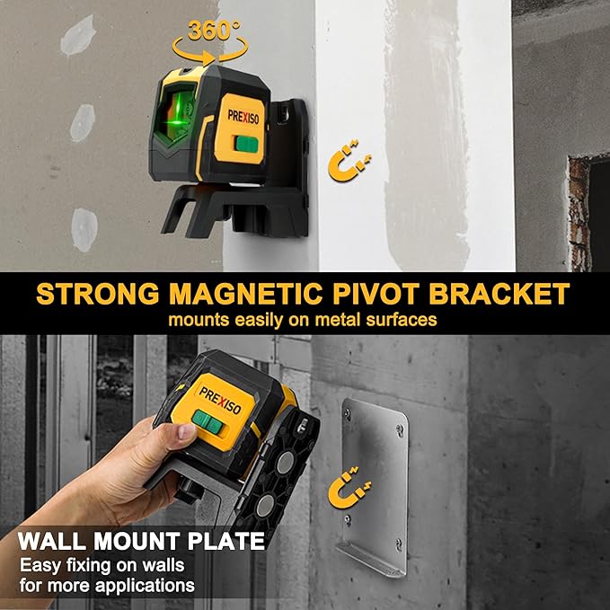 - Green Beam & Universal Usage: Green laser is 3 times brighter than red laser with the same light source; Class II laser product, maximum laser output < 1mW; PREXISO laser level covered by TPE soft rubber for shock-resistant and comfortable grip; Rotatable 360° magnetic mounting base to assemble with the 1/4"-20 treaded mount at the bottom of the tool