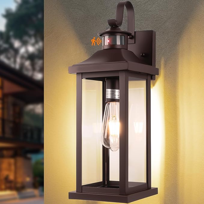 1-Pack 18 Inch Oil Rubbed Bronze Motion Sensor Outdoor Wall Lantern IP65 Waterproof, Large Brown Dusk to Dawn Outdoor Light for House Clear Glass Outside Wall Mounted Lamps Front Door