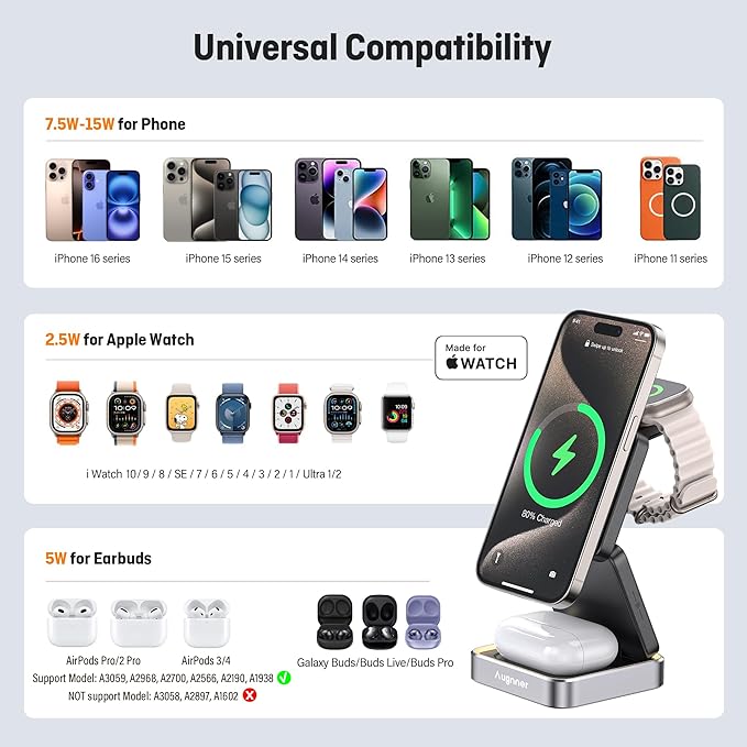 - Designed for Apple Enthusiasts:Fast 3 in 1 charging station for multiple devices Augnner compatible with iPhone 16/15/14/13/12 Series, All Apple Watch series and AirPods Pro/3/2(with wireless charging case) at the same time. The must-have magnetic charger stand for your home, office, travel