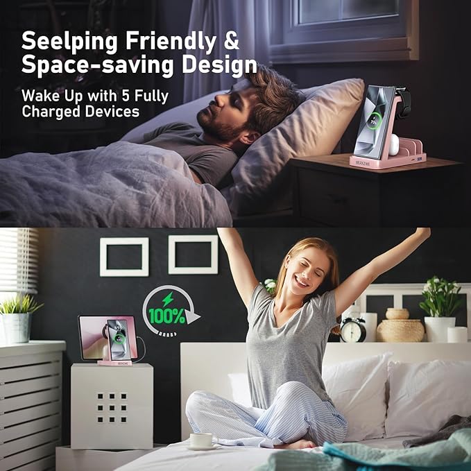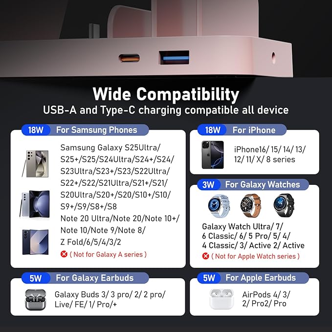 - 【Widly Compatibility】Our charging station works for almost all samsung android and iphone that support wireless charging (NOT FOR Galaxy A and Flip Series). Such as S25 Ultra/S25/S24 Ulta/S23/S22/S21/S20/Note20/10/9/8/7, Z Fold 7/6/5/4/3/2, iPhone 16/16e/16 Plus/16 Pro/16 Pro Max/iPhone 15/15 Plus/15 Pro/15 Pro Max/iPhone 14/14 Pro Max/14 Plus/14 Pro/iPhone 13/13 Pro/13 Pro Max/13 Mini/12/12 Pro/12 Pro Max/12 Mini/11/11 Pro/11 Pro Max/SE/XS MAX/X/XR/8/8 Plus