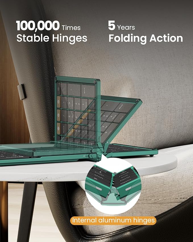 - Full-Size Productivity On The Go: A 105-key folding keyboard delivers a true desktop experience with dedicated function/number pads—ideal for spreadsheets, coding, or data entry anywhere. Designed for frequent travelers, its ultra-slim profile and flat typing surface (no tilt) enable effortless portability, while the simple fold-and-go mechanism (no locking clips) ensures quick deployment