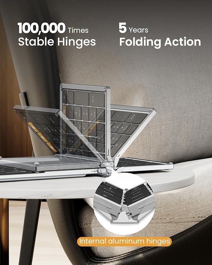 - Full-Size Productivity On The Go: A 105-key folding keyboard delivers a true desktop experience with dedicated function/number pads—ideal for spreadsheets, coding, or data entry anywhere. Designed for frequent travelers, its ultra-slim profile and flat typing surface (no tilt) enable effortless portability, while the simple fold-and-go mechanism (no locking clips) ensures quick deployment