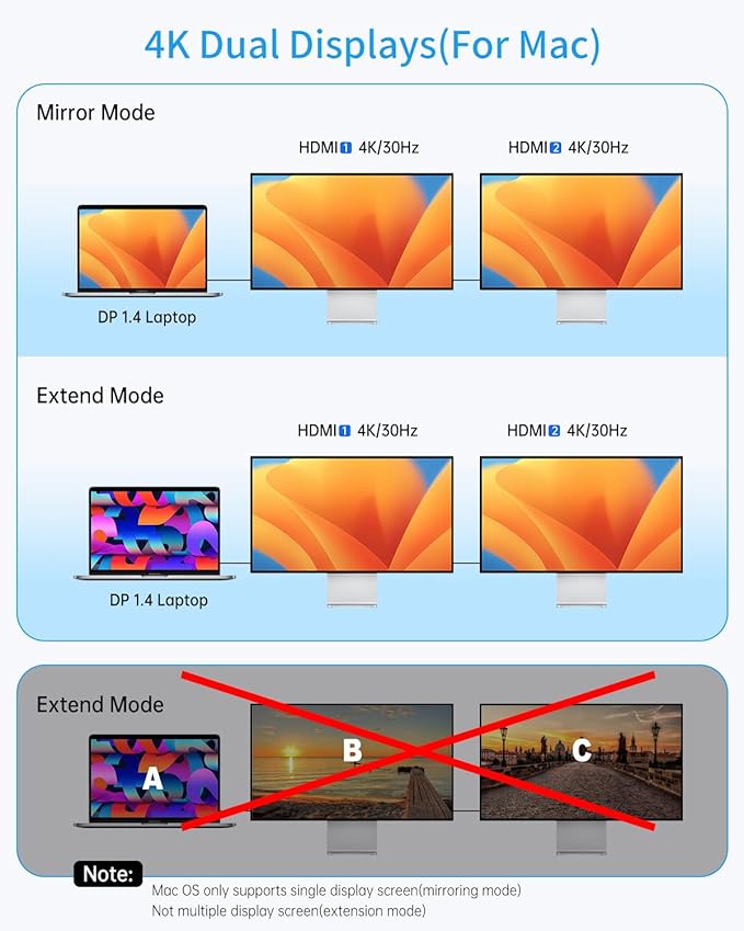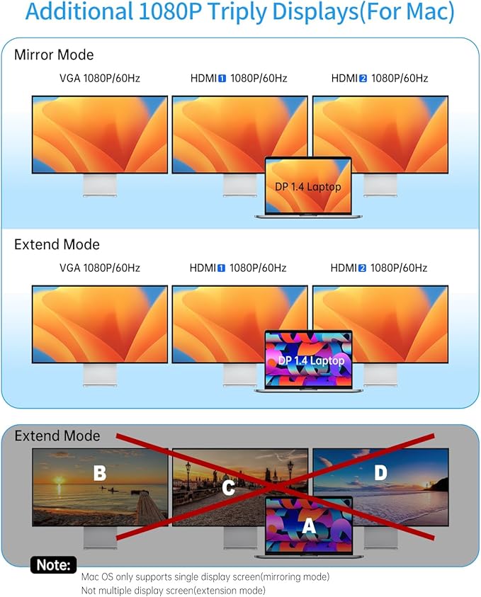 - Dual/Triple Display Capability: This USB C docking solution doubles as a usb hub for laptop and triples as a USB C Hub Multiport Adapter with docking station 3 monitors functionality. Outfitted with two HDMI and one VGA ports, it offers up to 4K@30Hz in dual display mode and achieves 1080P@60Hz in triple display setting. It enables convenient video extension to larger external displays, enhancing visual comfort and significantly boosting office productivity.