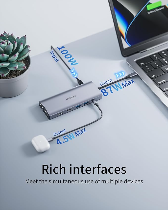 - Speedy charging 100W: This laptop dock is ideal for connecting dual 4K monitor, enhancing both work and entertainment experiences. It features a USB-C power delivery port next to the SD/TF slot, ensuring your device is always charged with up to 100W input and 87W output. The usb c adapter includes dual HDMI ports; however, note that power chargers and cables are not included. Important: The second USB C port is dedicated to data transfer only.