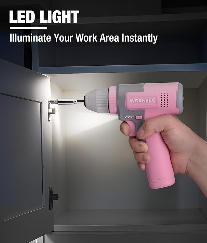 WORKPRO Pink Cordless 8V Drill Driver Set, 2Ah Electric Power Drill with 3/8'' Keyless Chuck, 15pcs Bits & 1 Type-C Charging Cord for Drilling and Screwing - Pink Ribbon