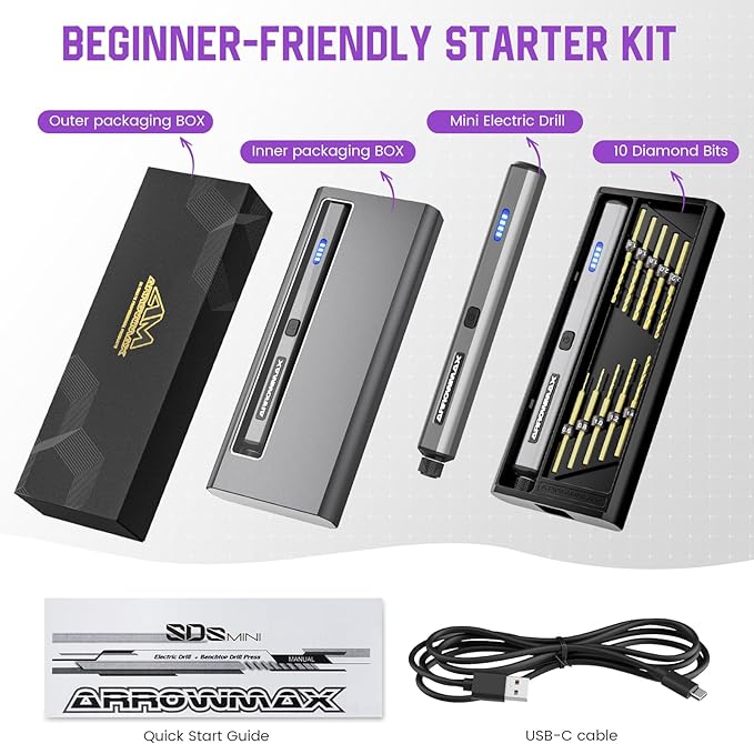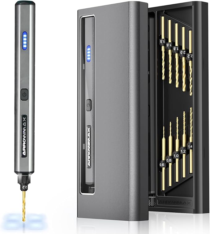 - 【Versatile Drill Kit for All Your Needs】This precision drill set comes fully loaded with 10 precisely marked drill bits, spanning from 0.6mm to 2.2mm with a universal 2.35mm shaft diameter. Versatile beyond measure, mini drill cordless's tailored for drilling through a diverse range of materials, from plastic and shell to wood,catering to the discerning needs of drilling . Swapping bits is a hassle-free experience, requiring no extra tools, while the aluminum case keeps them neatly organized.