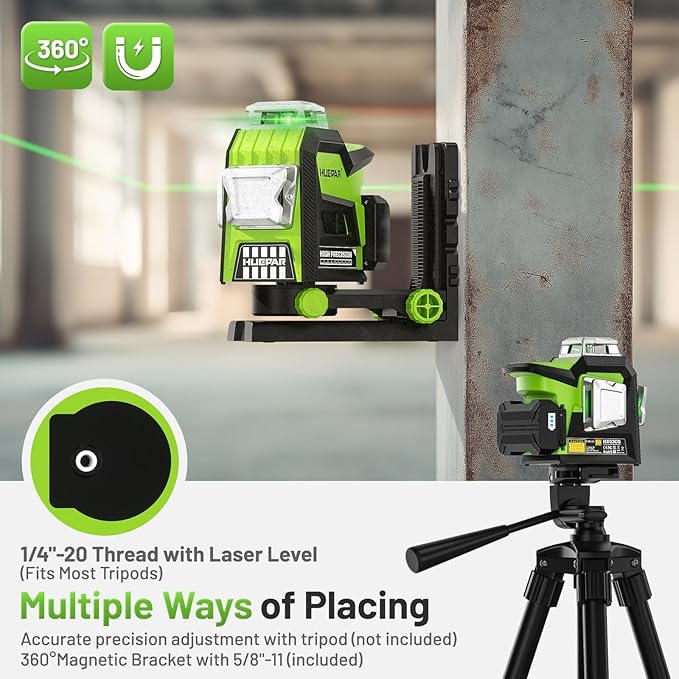 - 【360 Magnetic Bracket and Reliable Design】 The Huepar HX03CH comes with a magnetic bracket that allows for 360° horizontal rotation and features strong magnets to securely attach to metal surfaces. It also includes a 5/8 inch-11 mounting thread on the bottom, making it compatible with a wide range of tripods. Designed for construction, home improvement, and picture hanging, this laser level is built to IP54 standards for water and dust resistance, ensuring reliable performance in tough job site conditions. It also comes with a rugged hard carrying case for convenient transport and storage. Please reach out to us regarding any concerns, and we will be happy to assist you