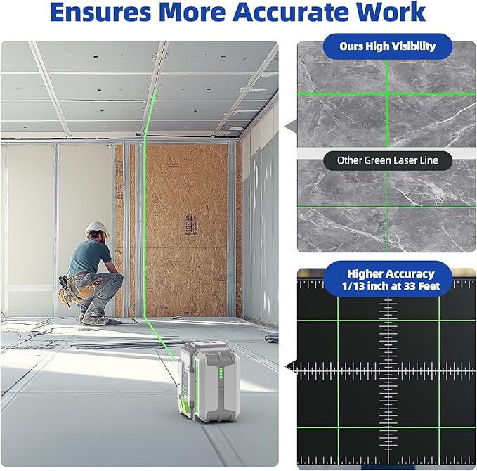 - 【3 Selectable Laser Line Modes & ±1/13 inch at 33Ft Higher Accuracy】The laser leveler has a 180°horizontal line and a 120° vertical line with higher accuracy in ±1/13 inch at 33Ft of ultra-bright green beam. Short press the power button, you can choose single horizontal laser line, vertical line or cross laser line separately or together for a variety of applications. Single-line mode saves more power and prolongs working time