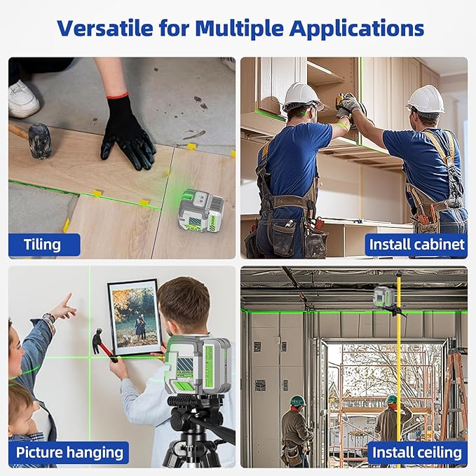 - 【Compact Size and High Protection Grade】The overall TPR soft rubber housing and compact lightweight design makes the line laser tool more durable and portable with 47.2" drop protection. It reaches IP54 protection grade (shock resistant, waterproof, dust-proof, cold and high temperature). The green leveling laser can help with home projects, for hanging pictures, wallpaper and making ceilings, also ideal for construction site work. Operation temperature range: -10℃~ +50 ℃