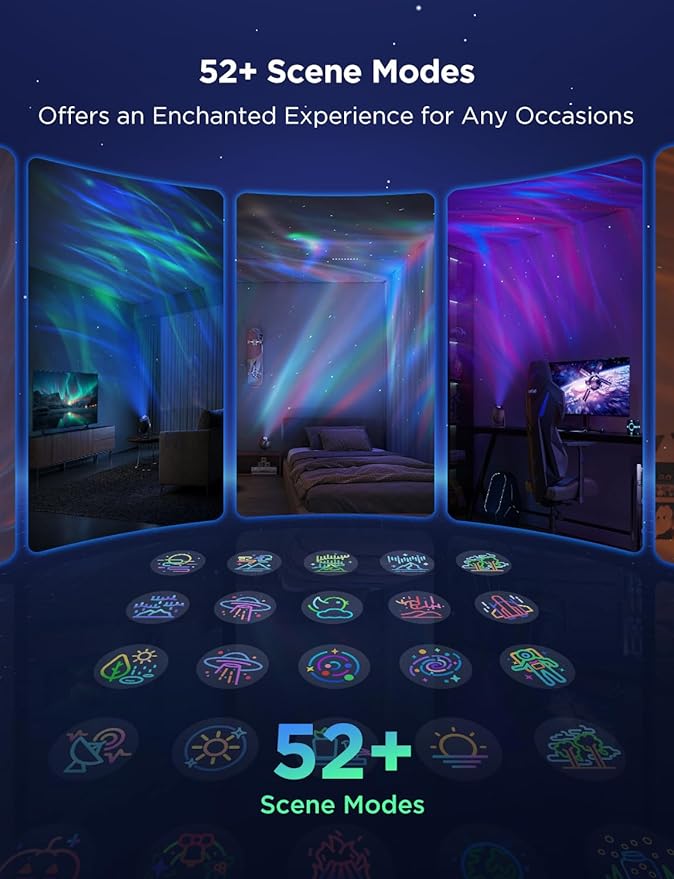 - Diverse Scene Modes: Offering over 52 scene modes and 18 white noise tracks, and a built-in Bluetooth speaker, our bedroom star projector galaxy light enriches every environment, whether you need a calm backdrop for sleep or a romantic mood.
