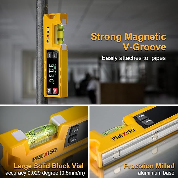 - Accuracy & Versatility: PREXISO digital torpedo level magnetic accurate to ±0.1° at 0° and 90°; ±0.2° at other angles featuring with protractor, angle finder and level in one measuring tool. With the reading hold function, the digital inclinometer is convenient for recording the accurate measurement of the angles of different measured surfaces for woodwork, saws, building modifications, improving home drainage changes and evaluating leveling work