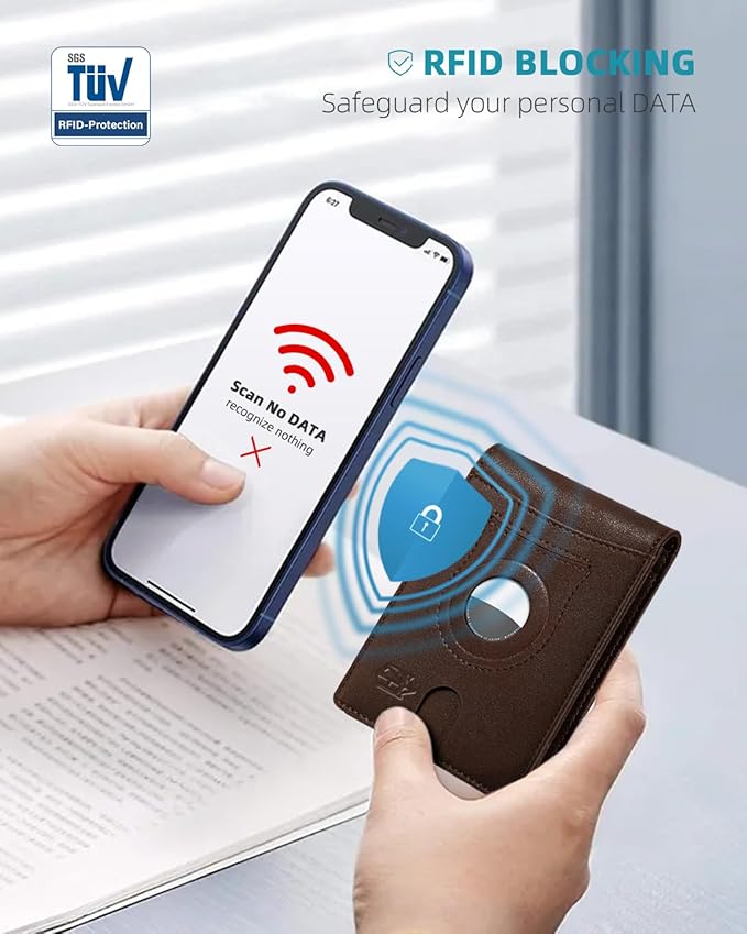 - ๐๐๐ ๐๐๐.๐๐๐๐๐๐๐.๐๐๐๐๐๐๐ - our wallets are equipped with German institute certified RFID SECURE Technology, a unique metal composite, engineered specifically to block 13.56 MHz or higher RFID signals and protect the valuable information stored on RFID chips from unauthorized scans.It is ideal for carrying business cards, credit and debit cards, bills et