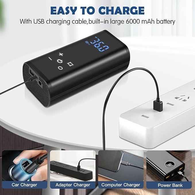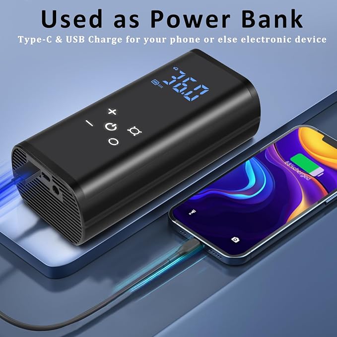 - 【Portable Air Compressor】This tire inflator built-in 6000mA rechargeable battery for power supply, eliminating the need to connect to an external power source during use. At the same time, you can also connect the car's cigarette lighter port to use the air pump, avoiding the situation of the tire pump running out of battery. The air compressor portable adopts a compact cordless design and is compact in size. easy storage in cars, bike racks, or backpacks.