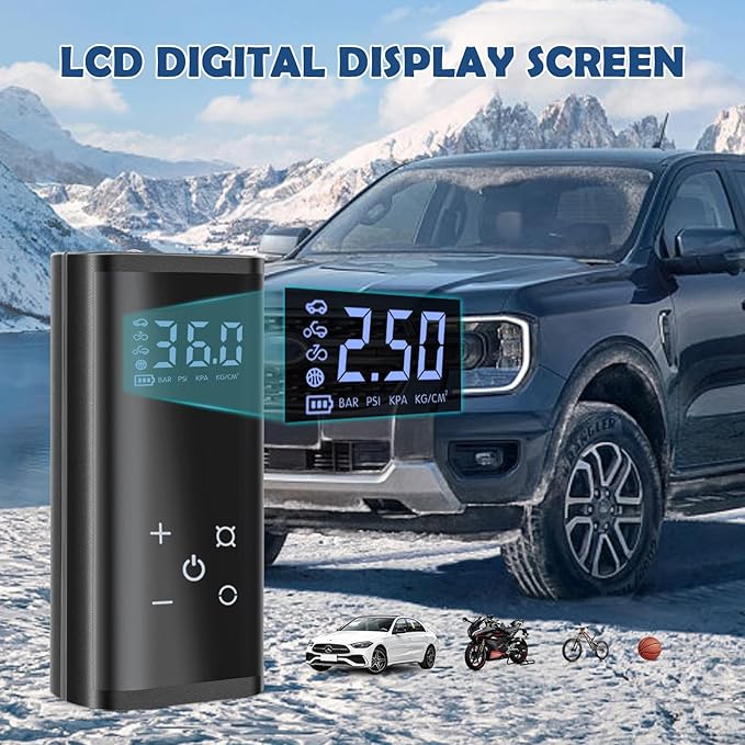 - 【4+N Inflation Mode】Easy to read Large LCD touch screen, The air pump for car tires has four types of pressure units: PSI, KPA, BAR, and KG/CM ². There are four preset inflation modes: bicycle, motorcycle, car, and ball. The fifth custom mode can also set pressure values based on the inflation object to meet various inflation needs. portable tire inflator for car is an essential product for daily life and travel.