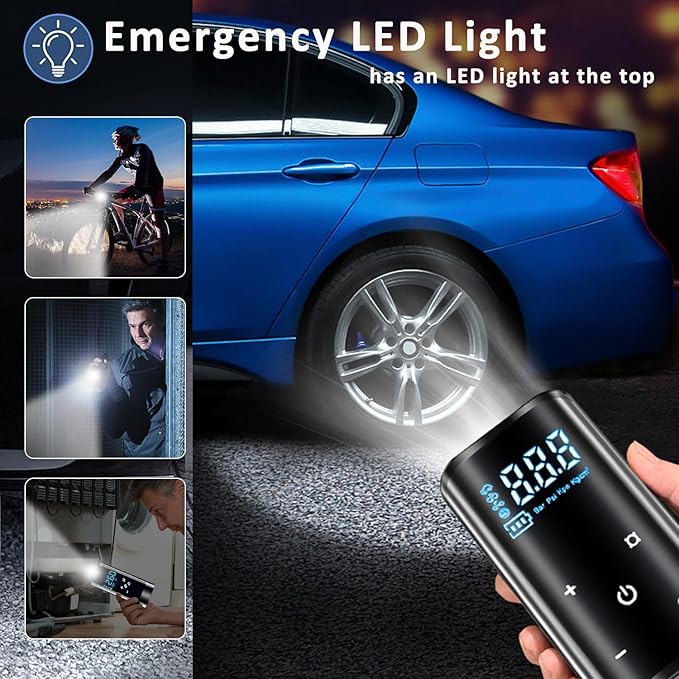 - 【Multifunctional Air Compressor】In addition to serving as an air compressor for car, it is also a multifunctional tool. it can be used as tire pressure gauge; It has an LED light at the top that can be used to inflate in the dark, change tires, or warn other vehicles at night. The bottom also includes a C-type charging port and a 5V/2A USB output port, allowing it to serve as an emergency power source for electronic devices.