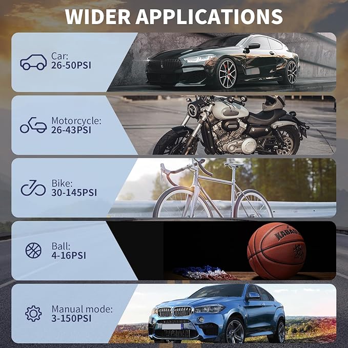 - 【Fast Inflation】The tire inflator portable air compressor built in high-performance chip that can quickly inflate tires. It provide maximum pressure of 150 PSI and airflow of 32L/Min! Only need 5 mins to fully inflate a car tire (0-36PSI). Perfect for inflating cars, motorcycles, bikes, balls, and other inflatables. Please NOTE that after 8 minutes of continuous use, let the car air pump rest and cool for 20 minutes before continuing use.