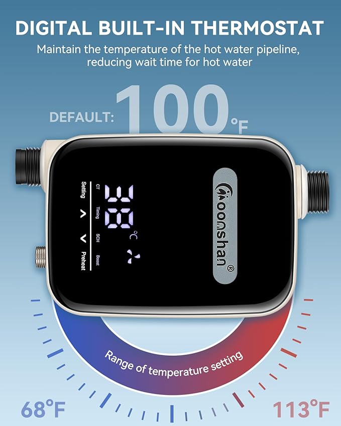 - 【Smart Built-in Thermostat】High-tech digital hot water recirculating pump is equipped with high-precision temperature sensor, hot water pump and thermostatic valve are integrated, no need to install additional sensor valve kit. The default temperature of the pump is 38℃ off and 33℃ on. When the water temperature in the pump is below 33℃ (91.4℉), the pump will push the cold water back to the water heater. When the temperature reaches 38℃(100.4F), the pump will automatically shut off. Compared to traditional sensor valves, the pump can be set to trigger start temperatures ranging from 20-45℃, making it more flexible and easy to use.