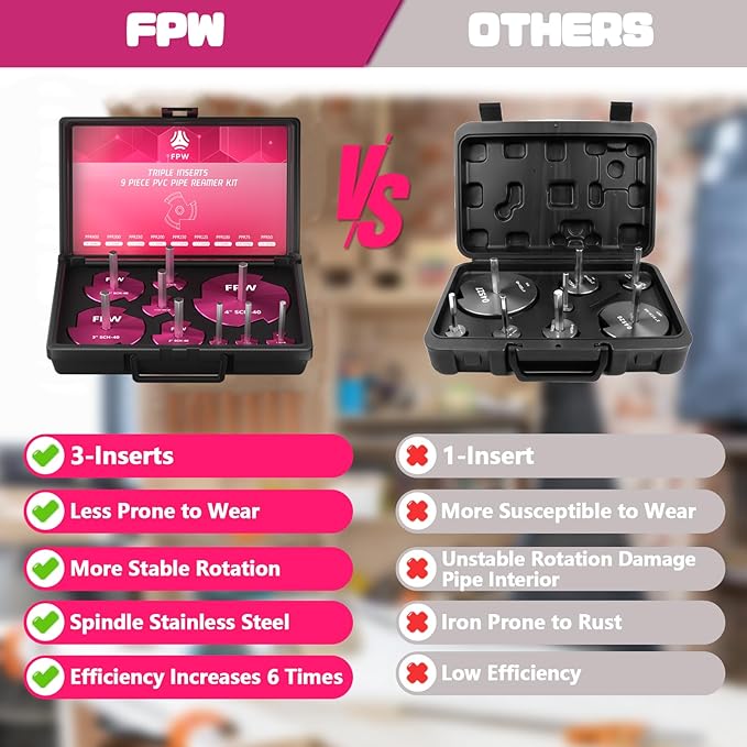 - 【Uncompromising Quality vs Imitations】Our Triple-Inserts PVC Pipe Reamer Kit features a solid steel hex shaft, engineered for superior rust resistance and long-term reliability. We use precision-ground screws for secure and stable carbide insert locking. The top-grade carbide inserts deliver enduring sharpness and precision, designed for extended use and reliable results. We will never use iron hexagonal bars, ordinary screws and low-quality blades