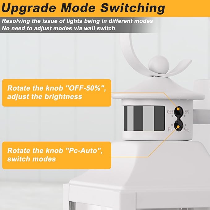 - 【Updated Motion Activated & Dusk to Dawn Sensor】Our motion sensor outdoor lights have 3 lighting modes: ①Dual-Bright MODE: With 0-50% adjustable dim light at night, activated with 100% light once motion detected, revert to dim light after 120s without movement, ②ON/OFF MODE: Keep off at night, 100% light once motion detected, revert to full off brightness without movement ③Dusk-to-Dawn MODE: Keep full brightness whole night. Lights will automatically turn off during the dawn in each mode