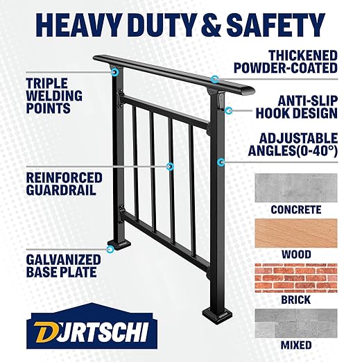 - 【Transitional Hand Railing For Any Surface】Our stair railings for outside steps seamlessly integrate with various materials - concrete, wood, brick, or a combination. The stable welding structure, along with crossbars, balusters, and bottom caps, ensures stability and a pleasing aesthetic. Choose the setup that complements your space