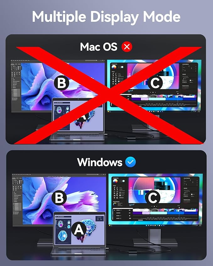 - USB-C to Dual 4K HDMI Adapter Hub 2 in 1: Attention!!! Mac OS ONLY support Mirror Mode(A-AA, A-BB), Can't extend two different Screen, due to Mac OS limitation.The dual monitor adapter expend your laptop’s FULL-FTEATURED USB C Ports into 2 hdmi port 4K@60Hz. You can enjoy movies, games with your families on external ultra HD big screen; Windows OS supports both SST and MST mode, if you not sure how to setting, please let us know, or download the user guide in Product information->Product informat