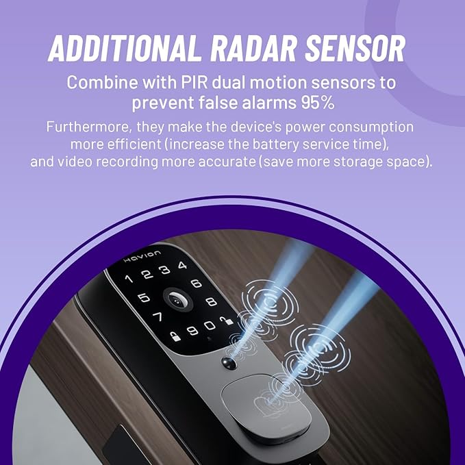 - [YOUR SMART GUARD] Enhanced Security with a Dual Lock Mechanism, combines traditional locking methods with modern smart features for maximum security. Dual detection combines PIR and radar sensors for enhanced motion detection. And receive real-time alerts whenever the system detects someone loitering near your door, ensuring you're always aware of any potential activity or security concerns immediately. Support fingerprint, password, smart App, and physical key to unlock.