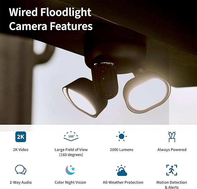 - Always Powered: Protect alleyways, driveways, & other expansive areas with the power of a Wired floodlight. A complete home monitoring system, that is IP65 weather resistant, add additional cameras throughout your exterior & interior.