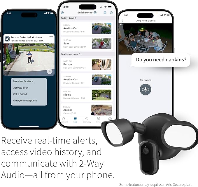 - Don’t miss a moment with the Arlo Secure App: Get real-time notifications with motion activation & live video streaming in the Arlo app. Includes activing the siren remotely, Color Night Vision, large Field of View (160 degrees) & camera floodlight.