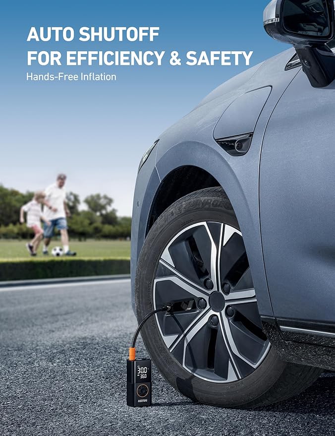 - LONG RUNTIME & AUTO-OFF: After fully charging, the built-in 4000mAh large-capacity battery allows the car tire pump to refill up to 8 tires (195/65R15) from 30-36PSI. The preset function and auto-off function deliver a hands-free inflation experience. With just one press, the cordless bike tire pump will easily inflate car tires, motorcycle tires, bicycle tires (700*23C/700*38C/29*2.25), ebike tires, balls, and more. (Note: Incompatible with heavy-duty tires.