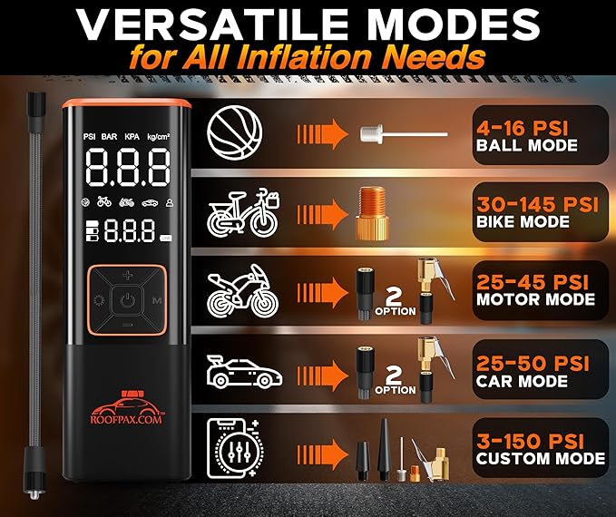 - Five Versatile Modes: This portable tire inflator for cars features five modes—Car, Bike, Motorcycle, Ball, and Manual. It’s the ultimate air tire pump for car portable versatility, covering all your inflation needs.
