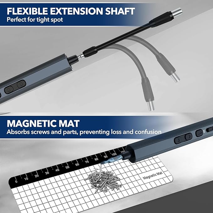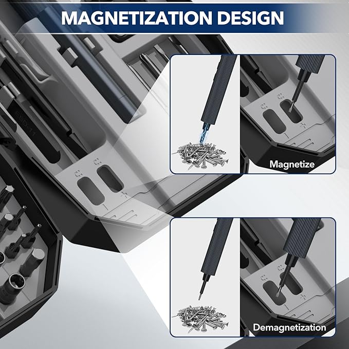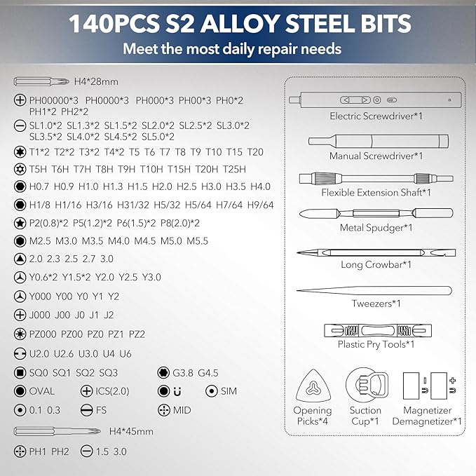 - DURABLE COMPLETE TOOL KIT: Every screwdriver head is made of high quality S2 steel with a hardness of up to 60HRC, ensuring a long and safe serving life. Comes with a magnetic case that keeps the screwdriver and 140 metal bits orderly in a place. Moreover, it features a magnetic pad that efficiently attracts all tiny screws and parts to prevent loss and confusion