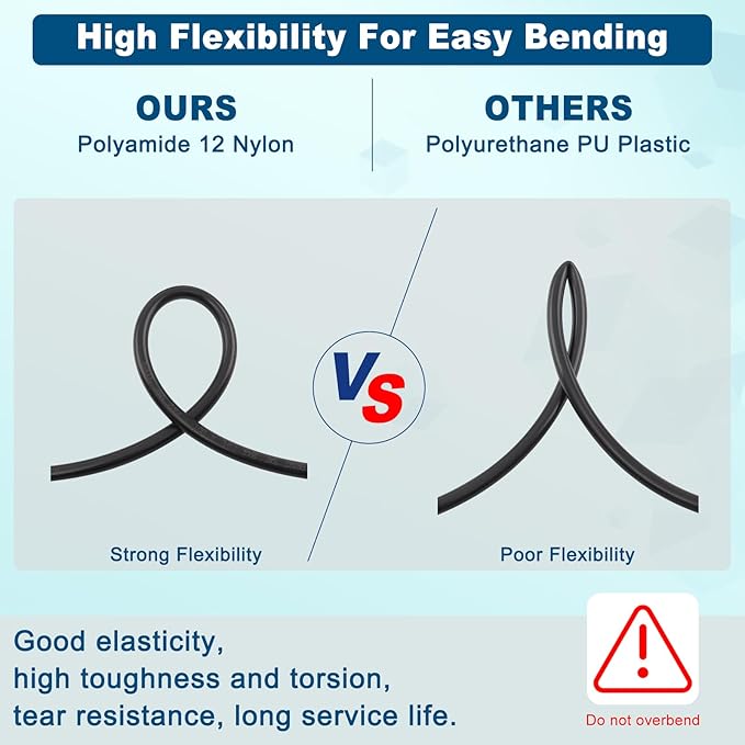 - 【High Flexibility for easy bending】High toughness nylon DOT tubing, you can bend it easily. Note: please bend it under limited condition, do not over bend it to affect the usage