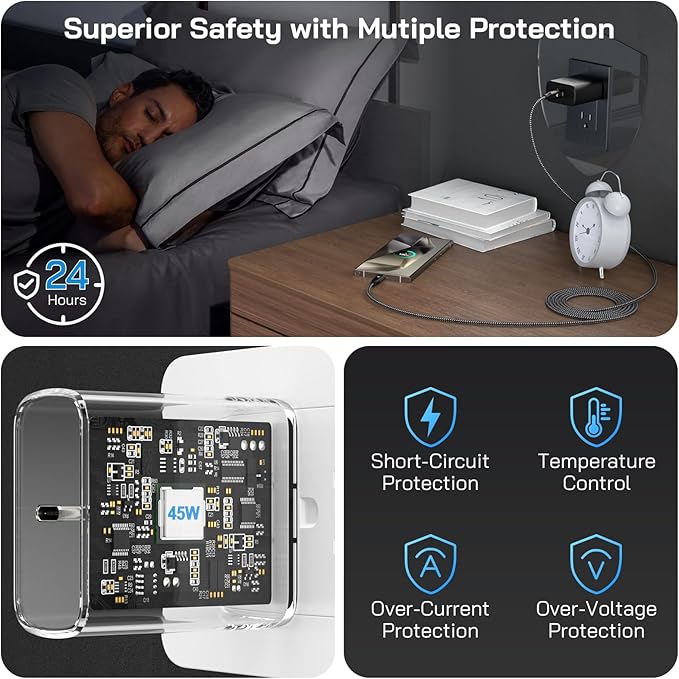 - 【What's Included】45W USB-C Charger Block x2, 10FT Type C to Type C Charger Cord for Samsung Phone x2, backed up by our worry-free 12-month warranty and 24/7 friendly customer support.