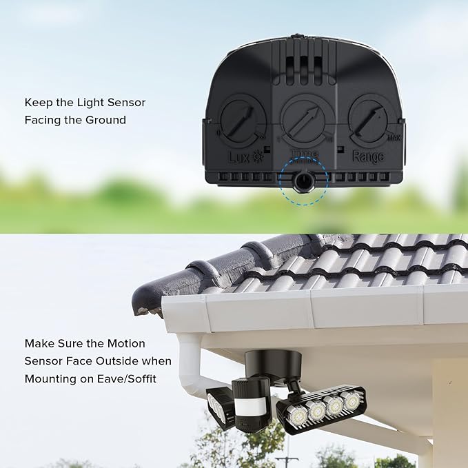 - LUX Setting Ease of Installation: High LUX will turn the light on all the time. Low LUX will cause the light to flash. If the motion sensor light outdoor stays on or flashes, please lower/higher the LUX to fit your ambient environment. Meanwhile, please make the garage light heads face upwards and make the sensor face downwards. This adjustment can decrease the influence of lighting on the sensor.
