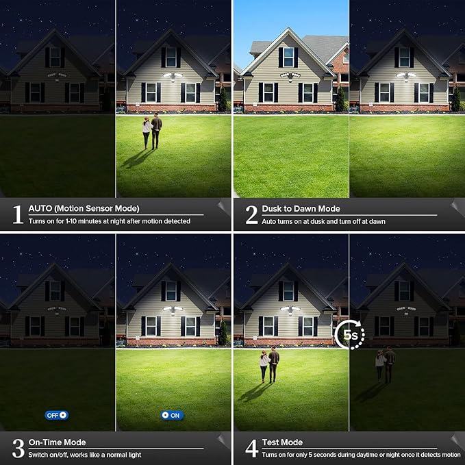 - 4 Modes Control Motion Detection: AUTO(Motion Sensor Mode), Detect ambient motion to turn on the light. The max. detection range is 72 FT and the detection angle is 180°. Dusk to Dawn Mode, Auto turns on at dusk and turn off at dawn. On-Time Mode, Manual control lights keep ON by switch. Recommend Lux setting is halfway on the Lux dial.