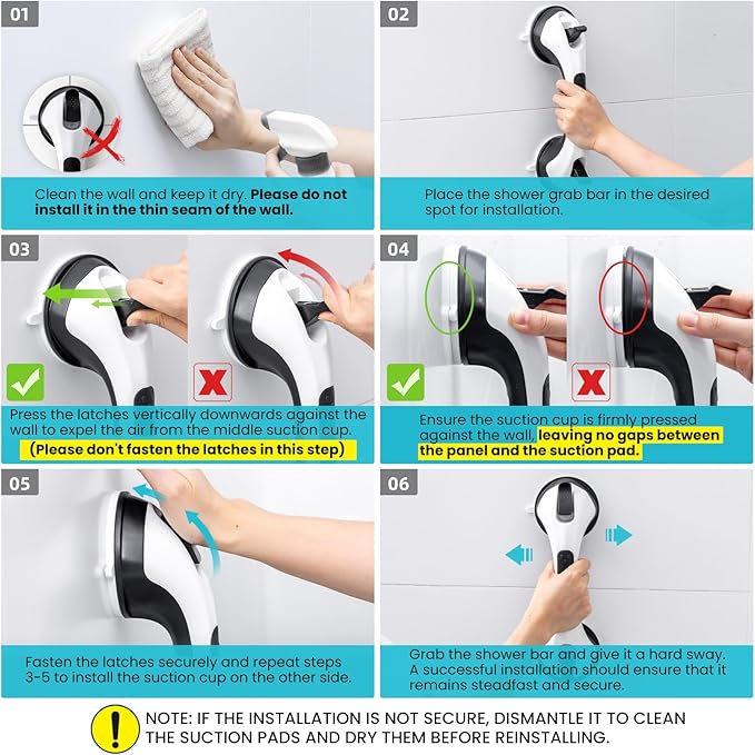 - Matters need Attention: For the safety of the seniors and elderly, please pay attention that the suction grab bars for shower ONLY sticks on smooth and non-porous AIRTIGHT walls which are NOT air-permeable like metal, glass, tile, marble, stainless steel and acrylic but does NOT apply on uneven tile, unfinished marble, wallpaper, dry wall, porous wall, etc. Please don't put all the body on the shower grip