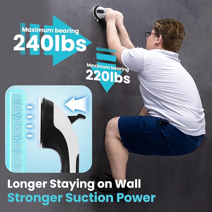 - Easy for Installation: Each suction cup shower handle equips 2 Strong suction cups with locking latches to provide stable protection. The bathtub hand rail ONLY needs to pull down the latches with 5 seconds and the installation is done, quickly and effortlessly! NO drilling, NO screws, NO glue and NO tools are required, fully removable, reusable and causing no damage to your wall