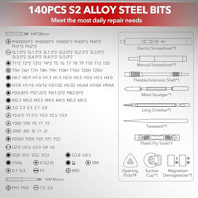 - DURABLE COMPLETE TOOL KIT: Every screwdriver head is made of high quality S2 steel with a hardness of up to 60HRC, ensuring a long and safe serving life. Comes with a magnetic case that keeps the screwdriver and 140 metal bits orderly in a place. Moreover, it features a magnetic pad that efficiently attracts all tiny screws and parts to prevent loss and confusion