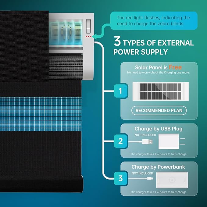 - ENVIRONMENTAL AND COST SAVING: Our motorized zebra blinds are not only convenient,but motorized blinds are also environmentally friendly. Solar powered motorized zebra blinds are charged automatically during the day, eliminating the need for batteries or frequent charging, saving money and reducing their carbon footprint. Join us and contribute to the eco-friendly home without sacrificing fashion. Our motorized blinds have a stylish and modern design that adds a touch of elegance to any room .