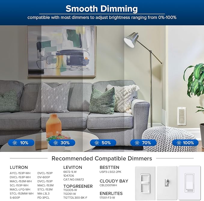 - 5000K DIMMABLE: This 5000K daylight white SANSI LED bulb offers smooth dimming from 0 to 100 and is compatible with TRIAC dimmers.The dimmable Led light bulbs are easy for you to adjust the light brightness and create the perfect atmosphere at any time, ideal for kitchen, living room, bedroom, and commercial lighting