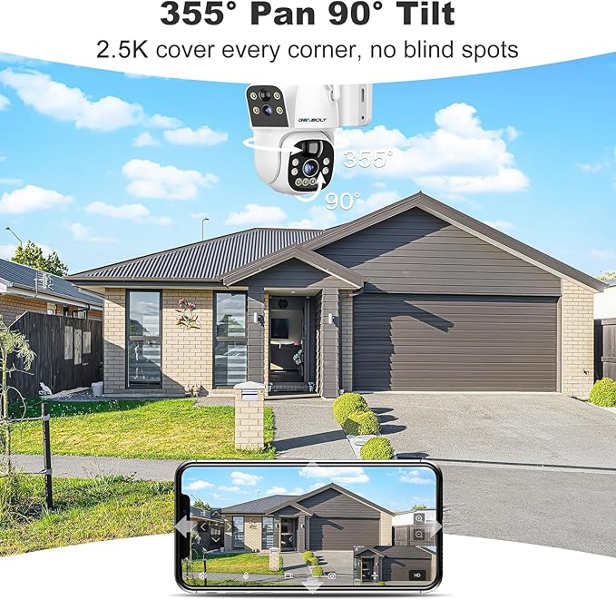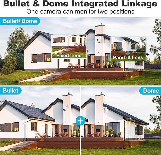 - ๐[Dual Lens & Dual Screen] The wifi camera outdoor features a dual lens design for comprehensive coverage, no blind spots. The upper bullet camera is fixed in one place to provide a wide angle defense. The PT dome camera can rotated 355ยฐ/90ยฐ. So you can view one same or two different areas at the same time by using one camera