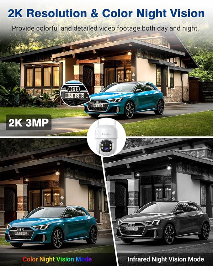 - 【2K 3MP Live Video & Color Night Vision】Septekon wireless security camera provides 2K Full HD resolution, ensuring crystal-clear video quality both day and night. Built-in 2 IR lights and 2 white lights, you can see vivid and accurate colors in low-light conditions. (Note: The spotlight feature must be manually activated to view color night vision)