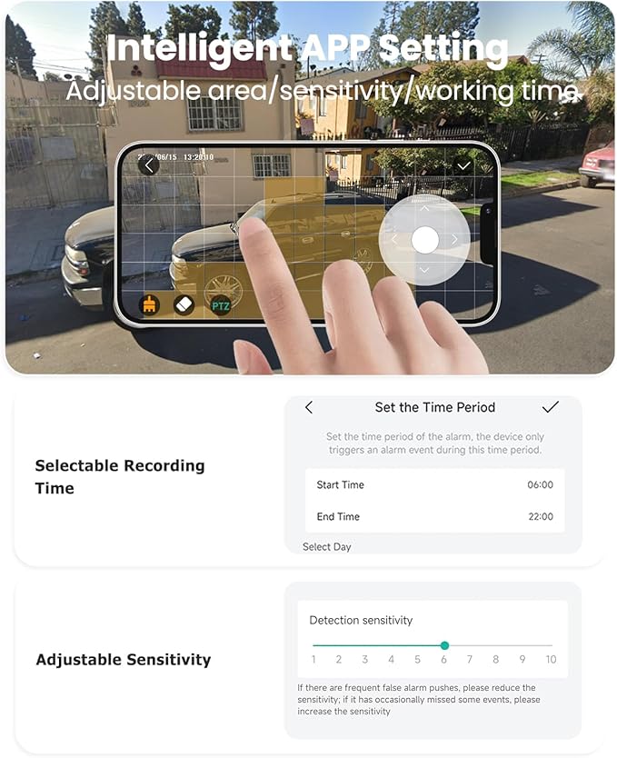 - [AI Powered Human Motion Detection & Smart APP Settings] Rebluum outdoor security camera wireless supports human motion detection which can reduce false alarms by up to 90%. Customize the motion area, set the montion sensitivity and make recording time plan to meet your diverse home security needs with the user-friendly app.We also offer paid features: pet/vehicle/package smart analytics.This PTZ camera is great for home and business security