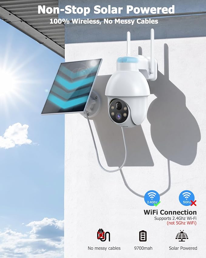 - [Wireless Solar Powered] Rebluum solar camera security outdoor has a 9700mah battery built in to provide continuous power for wireless outside cameras with high conversion rate solar panels. When the solar security camera is turned off, it will automatically switch on with saved power, reducing the camera's downtime for charging and making it simple to set up without the concern of messy wiring work.