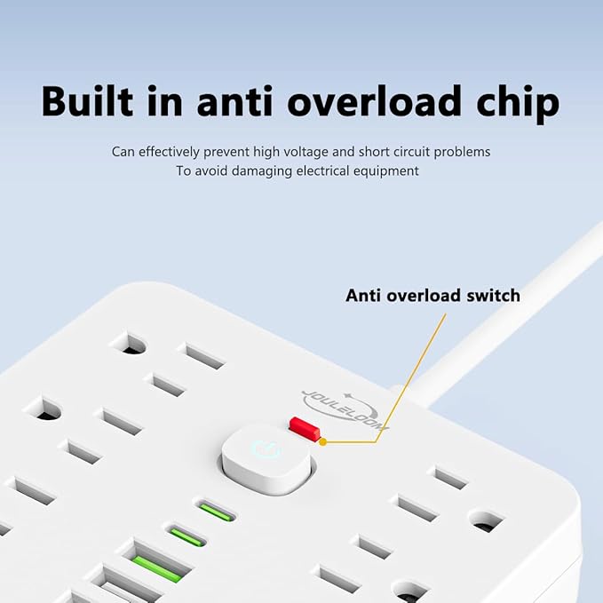 - 🛡️【Multiple Security Protection】JouleLoom 17in1 power strip integrates an 8-point safety system, including surge protection, fire resistance, overload protection, temperature control, and more. It has overload protection and will light up red during normal operation. When overloaded, the power switch will automatically trip to protect the equipment. Press the switch to restore. It ensures complete safety for you and your devices, whether at home or in the office, for long-lasting and stable operation.