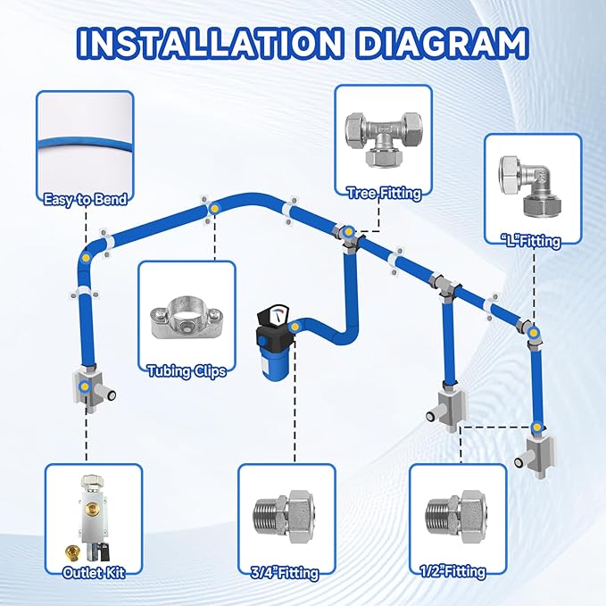 - ✅【Package Contents】: The 120ft Air Line Kit comes with 3 valve outlet kit, 2 L-shaped fittings, 2 T-shaped fittings, 1 3/4" NPT fitting, 1 chamfer tool, 1 pipe cutter, a pair of gloves, 35 expansion screws, 20 pipe clamps for drainage, a roll of teflon tape, and 120ft airline tubing.