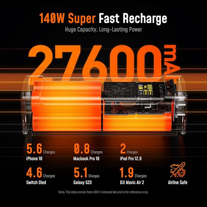 - 27,600mAh Ultra-High Capacity – Power That Lasts: With a massive 27,600mAh capacity, the AOHI Future Starship power bank can recharge an iPhone 16 up to 5.6 times or a 12.9" iPad Pro about twice, or a MacBook Pro 16" approximately one times, ensuring your devices stay powered during long trips and heavy use. Plus, with a 99.36Wh rating, it complies with TSA regulations (<100Wh), making it safe for carry-on luggage when traveling by air. This high-capacity power bank provides reliable power for a variety of devices, ensuring you’re never caught without backup when you need it most